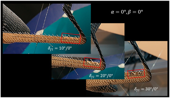 The flaperons deflected downward do not increase the aircraft lift as was expected (Figure 17). In fact, the use of flaperons reduces the aircraft lift, which means that the lift-generating surface of the wing decreases. This conclusion is supported by the tuft patterns shown in Figure 18. The tuft patterns reveal a turbulent boundary layer at δfl = 10° and separation starting from δfl = 20°.