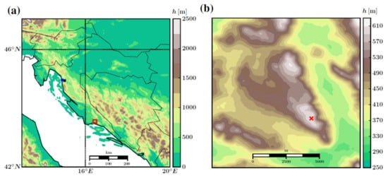 The data used were obtained from the measuring tower on Pometeno brdo (“Swept-Away Hill”, 43° 36′ N, 16° 28′ E), nearby Dugopolje, in the hinterland of the second largest city in Croatia, Split (Figure 1). The hill itself is oriented in the north−west to south−east direction of the Dinaric Alps, thereby it is perpendicular to the mean direction of the bora flow. The three−level measuring tower was located at the top of Pometeno brdo (approximately 620 m above mean sea level, ASL in m) and was surrounded by the complex heterogeneous terrain. A detailed description of the measuring site and surrounding orography is given in Babić et al. [].