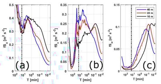 Finally, a composite spectrum of all 60 bora episodes was obtained. Medians of weighted spectra are shown in Figure 2. Weighted spectra, fS(f), are very suitable for the analysis because the area under the spectral curve represents the variance of the analysed variable, i.e., the energy of the wind in our case. A spectral minimum in the weighted spectra of u and v components is obvious; however, it is not possible to observe a clear minimum in spectra of w component. This is because w component spectra do not contain large amount of energy at larger, i.e., synoptic scales since bora flows are driven by cyclonic, anticyclonic or frontal systems, where horizontal motions are predominant. Therefore, w component spectra for bora flows do not exhibit a maximum on the left side of the spectrum (e.g., []). Nevertheless, based on our u and v spectra, it is estimated that the spectral gap is around the period of T 15 min. Although this estimate is somewhat subjective and based on the visualisation of the spectrum, it is accepted within the scope of this paper as it also agrees with the other results on the topic of bora’s turbulence on Pometeno brdo (e.g., [,]). Moreover, we decided not to expand a spectral gap scale further (e.g., to a value of 30 min, which is a kind of standard in the literature) because we want to avoid possible contamination of turbulence by the sub−mesoscale features, whose presence is clearly evident in our v wind speed component spectrum (indicated by the pronounced peak in the spectrum on scales between 15 and 30 min).