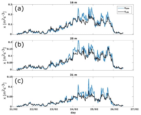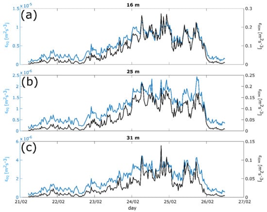 where coefficients a and b have the values shown in Figure 4. The results for the longest bora episode are given in Figure 5. The deviations between and are the smallest for relatively weak VD; by increasing the dissipation values, the deviations increase as well. It is also clear that does not reproduce the maximum values of appropriately. This might be due to the fact that the relationship between and is not quite linear as we assumed, but based on the scatter plots shown in Figure 4, it is hard to presume anything else beyond the linear relationship between the two. Furthermore, is in some cases negative, which is not physically justified; VD is the ultimate destruction of TKE and should always represent a negative term in Equation (2). Hence, is always positive and with the minus sign in Equation (2) always corresponds to the destruction of turbulence energy. The same is not true for which apparently takes negative values at the beginning and the end of each bora episode; in those cases, the corresponding values are small, and with negative b coefficient becomes spuriously negative.