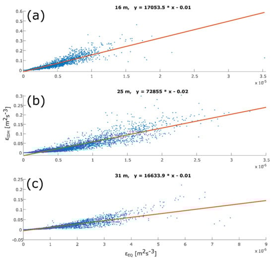 Linear regression between VD obtained by IDM () and by direct approach ( ) for all bora episodes and at (a) 16 m, (b) 25 m and (c) 31 m mid−levels. The intercept y and the slope term are given in the title.