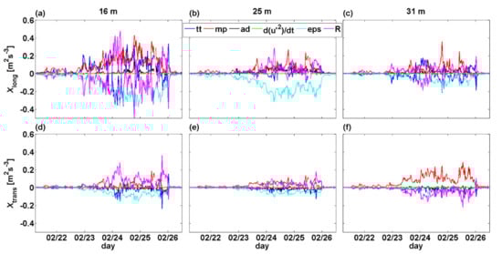 Time series of all the terms in Equation (2) at all three mid−levels: (a,d) 16 m, (b,e) 25 m, (c,f) 31 m for the longest bora episode. For every mid−level, the upper subplot (a–c) shows longitudinal and the lower (d–f) transversal terms. The terms are marked as follows: turbulence transport—black, mechanical production—red, advection of the variance by the mean wind—dark blue, local rate of change of the variance—green, VD—light blue, and the residual term—grey.