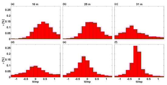 Histograms of the ratios between turbulence transport and mechanical production terms obtained for: (a,d) 16 m, (b,e) 25 m and (c,f) 31 m mid−levels. For every mid−level, the upper histograms, (a–c), refer to the longitudinal, and the lower histograms, (d–f), to the transversal direction. Medians are given in Table 2.