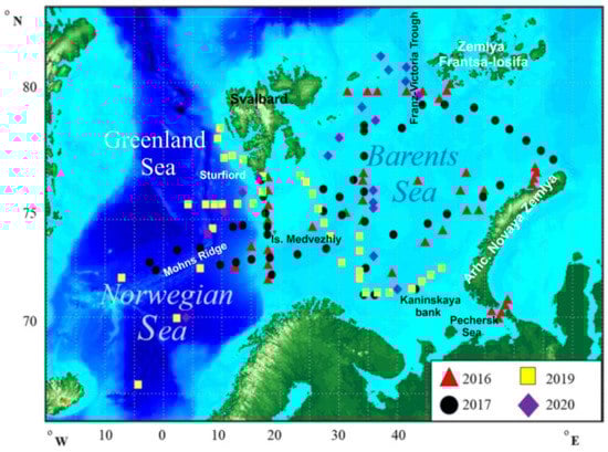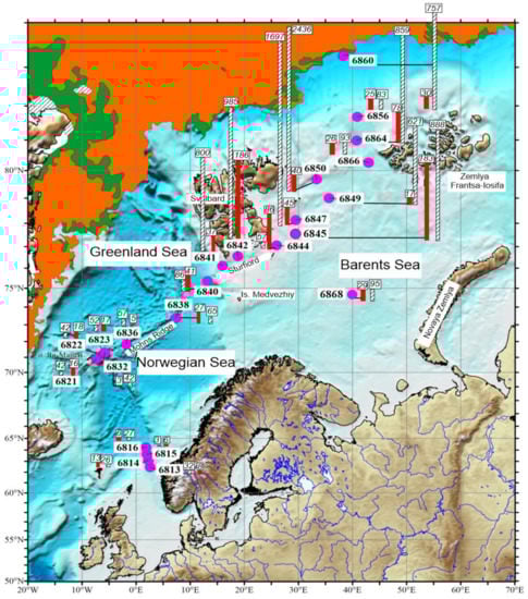 In different years, the research on the cruises of the R/V Akademik Mstislav Keldysh in the Norwegian and Barents Seas covered water and sediments in hydrothermal fields located within the Jan Mayenne axial volcanic uplift of the Mohns Ridge; in places of outcrops of cold methane seeps on the continental margins of the Spitsbergen archipelago; the Medvezhinsky Trench, the Novaya Zemlya shelf, and craters in the central part of the Barents Sea were examined [13,14,15,16] (Figure 1).