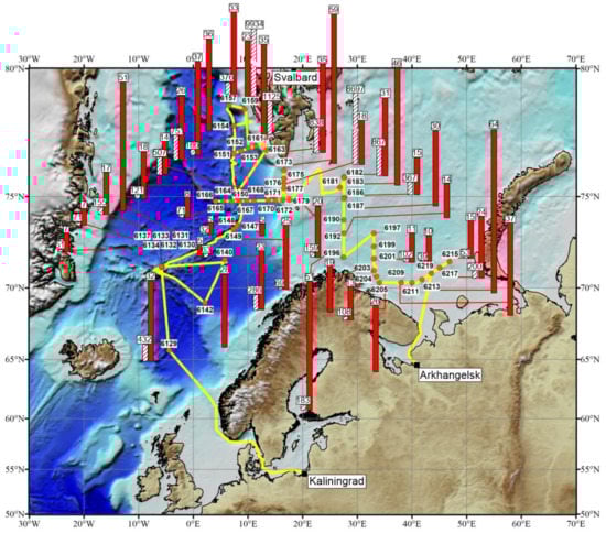 - Klyuvitkin, A.A.; Politova, N.V.; Novigatsky, A.N.; Kravchishina, M.D. Studies of the European Arctic during the 80th Cruise of the Research Vessel Akademik Mstislav Keldysh. Oceanology 2021, 61, 139–141. [Google Scholar] [CrossRef]