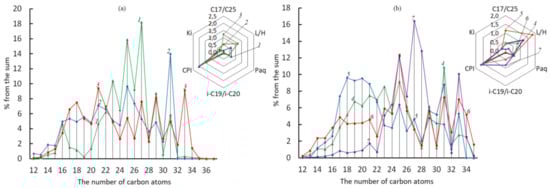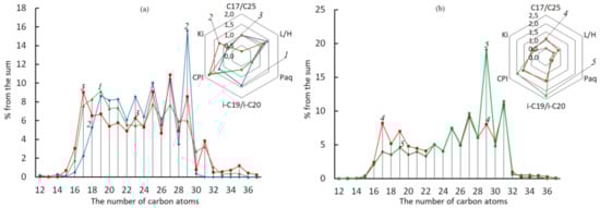 Composition of n-alkanes in the surface layer of bottom sediments at individual stations (80 cruise R/V Akademik Mstislav Keldysh, 2020) (a), 1—station 6844, 2—station 6845, 3—station 6847, (b), 4—station 6849, 5—station. 6860. Inset: the distribution of markers in their composition.