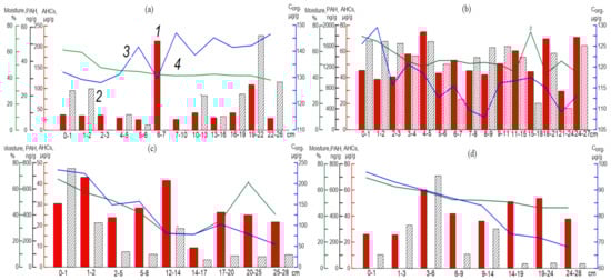 Changes in the concentrations of AHCs (1), PAHs (2), Corg (3) and moisture (4) precipitation with the depth at stations 6841 (a), 6847 (b), 6860 (c) and 6866 (d). The location of the stations is shown in Figure 4.