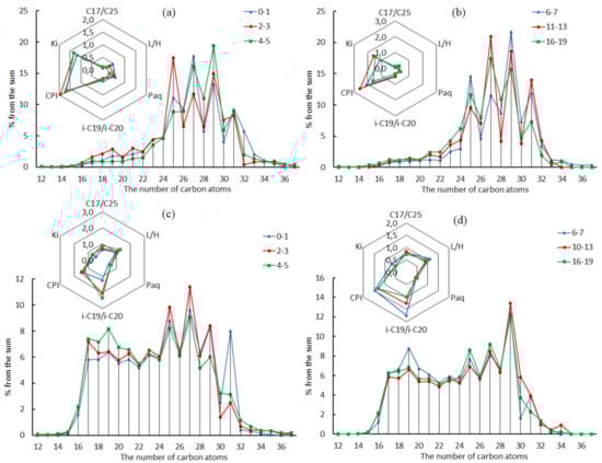 Composition of alkanes with burial depth at stations 6840 (a,b) and 6841 (c,d) and the distribution of the main markers in their composition. The location of the stations is shown in Figure 4.