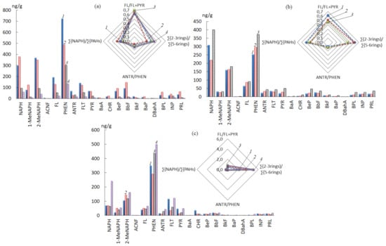Changes in PAH composition with burial depth (a) at station 6841: 1—0-1, 2—3-4, 3—5-6, 4—7-8 cm; (b) station 6847: 1—1–2, 2—5–6, 3—24–27 cm; (c) station 6864: 1—0–1 cm, 2—3–4 cm, 3—13–16 cm, 4—24–26 cm. The location of the stations is shown in Figure 4.