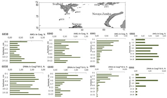 Favorable ice conditions provided a unique opportunity to conduct research within the Franz Victoria Trench from depths of 3700 m (station 6860) to the shelf with a depth of 593 m (station 6864) and 403 m (station 6866), i.e., within the water area usually covered with ice. Here, the content of AHC (average 25 µg/g) in the surface layer of sediments was the lowest (Table S1).