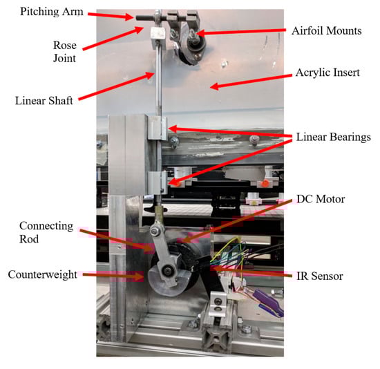 A mechanical oscillator was constructed to actuate the wing at the desired frequency and its components and functionality are described in the following. While the wing was attached to the column that allowed it to rotate freely along its rotation axis, the actuation rod behind the rotation axis was attached to an actuating linear shaft. This shaft rides along a set of linear bearings to keep it on track. A counterweight and connecting arm were machined out of aluminum and arranged in a crankshaft formation to produce the sinusoidal action. A UL 12V DC motor, capable of delivering up to 3000 RPM, was mounted at the center of the counterweight. The connecting arm was located 15 mm away in the radial direction, from the center of rotation, to produce a maximum stroke of 30 mm. The counterweight was made from stock aluminum and intended to possess a high moment of inertia to maintain stability at high frequencies. To achieve greater dynamic balance, half of the counterweight was machined off on one side to counteract the moment applied by the weight of the rod and any loads induced by the wing. The entire fixture was mounted to a thick piece of aluminum connected to a platform adjacent to the wall of the wind tunnel. Figure 2 shows the assembly and part components. A rose joint that allows traveling freely on another shaft called the pitching arm was fixed to the end of the linear shaft. The pitching arm was connected to the rods inserted into the wing and protruded through an acrylic insert. Although the model could deliver the necessary parameter values of interest, it still produced a considerable amount of transverse vibration due to the unbalanced dynamic load. Future considerations are being implemented to eliminate unwanted interference from the apparatus while in operation using a more balancing counterweight, lighter push rod, and a more robust connecting solution to fix it to the pivoted wing. The linear bearings and shaft were some of the few parts which were purchased new for this current design.