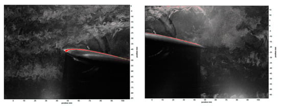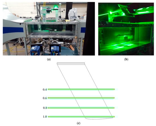 The photography in Figure 4 show the setup (Figure 4a) and the data capture (Figure 4b) during testing while the laser was firing. The wing being tested and the seeded particles can be seen in the center of the wind tunnel section. The seeding of the air during testing was acquired by dispersing the atomized ‘DEHS’ oil into the inlet area corresponding only to the location of the projected laser volume in the test section. Before collecting the data, magnification calibration was performed using LaVision ‘DaVis’ software. For data processing, each wing angle of attack required a different mask to remove areas that did not have the laser illumination to provide a clean reconstruction of the airflow that was acquired in each data set. Flat-black and ‘Dykeem Steel Red’ paints were applied to the surface of the wing to minimize the laser reflection from the surface of the wing. The red paint absorbed the green laser color, and only a dim red reflection remained; this remaining light could be readily filtered out in the image with a camera green filter if needed.