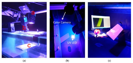 Photography of typical PSP setup: (a) UV LED (indicated with an ‘a’), 35 Hz color camera with proper filters (indicated with a ‘b’), PSP painted wing (indicated with a ‘c’) (a) and the current experiment swept wing sample setup with Turbo PSP (b,c).