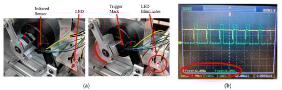 The color camera was synchronized with the specific pitching angles (‘phases’) of the pitching cycle using the following method. A basic circuit was built using an infrared sensor and a transistor which would be the source of the external trigger. A small piece of tape would pass between the beam of the infrared sensor, which would close the gate to a 2222 N transistor and create a pulse. This output pulse could be measured easily with an oscilloscope to obtain the frequency of rotation. Figure 6a shows the basic function of the rudimentary trigger circuit.