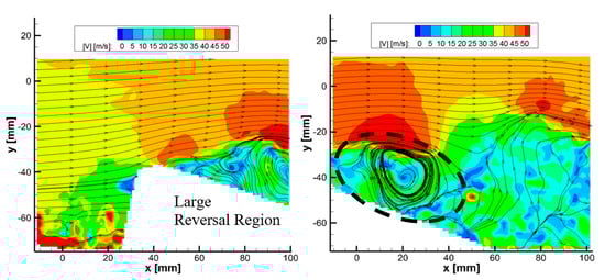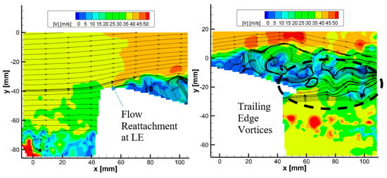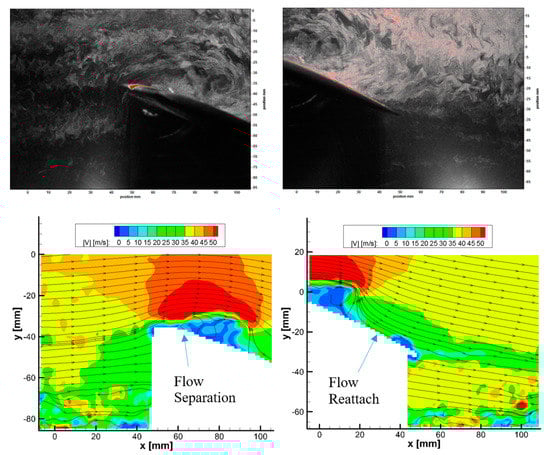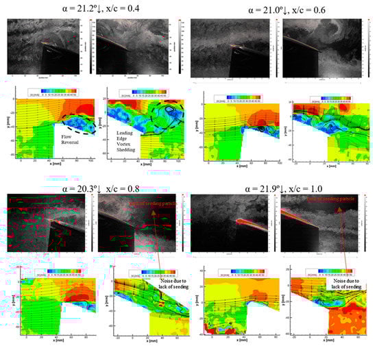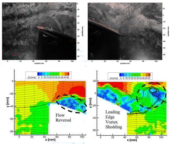 The PIV data taken with the unswept wing was analyzed and compared to previously existing data from the literature [3,9,10,11]. Three frames that correspond to angles of attack between the critical angles of 19° ↑ and 12° ↓ were selected for presentation and discussion at the spanwise position closer to the wing root, x/c = 0.4. Under the dynamic motion, the wing began to show a high degree of flow reversal at approximately 18°, referenced to free stream flow direction. In Figure 8, Figure 9 and Figure 10 shown below, flow visualization and vector maps display various characteristic pitching flow features. They include the formation of the separation region, the dynamic stall, the reattachment region while pitching upward, the flow when reaching a maximum angle, and the flow when pitching down. The following discusses these observations.