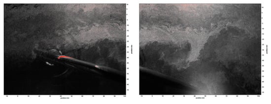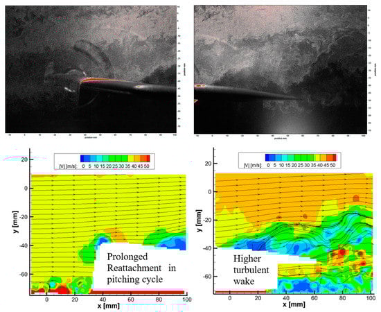 It was observed, as shown in Figure 11, Figure 12 and Figure 13, that for comparable pitching angles, the swept wing at 15° flow remained attached for a longer duration during the pitching cycle than that of the unswept case. The contours shown in Figure 11 suggest some leading-edge reversal, but due to background and surface reflection noise, it cannot be fully stated yet. However, it was noticed that more clearly defined flow reversal started much later in the pitching cycle, beyond 20° ↑. Interestingly, flow reversal at the top surface seemed to increase as the wing began to pitch downwards, as shown in Figure 12. As the downwards motion continued, flow reattachment at the leading edge was observed, and as the angle approached 14° ↓, the velocity contour showed flow reattachment. The reattachment of the flow and vortex shedding from the trailing edge of the wing is shown in Figure 13. It is possible that this is due to the larger flow reversal region, which travels back to the free stream before the flow can reattach. Flow characteristics over the laminar separation bubble are comparable to that of the unswept wing case (in the way the flow streams over the reversed region). However, the wake following the reversed region for this swept case was much greater than that from the unswept case. Furthermore, as shown in Figure 13, the shed turbulent region over the remainder of the separation region during the downstroke possesses a larger magnitude of rotation when compared to the unswept case. Interestingly, the leading-edge reattachment seemed to be prolonged to further in the pitching cycle for the swept wing than for the unswept wing.