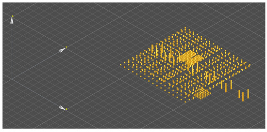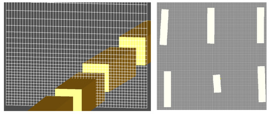 The same grid presented in Table 1 was used to discretize the field. The height of the cells near the ground satisfies the minimum grid analysis proposed in the work [15], i.e., 1/10 of the height of the building of 2.54 m (Figure 5). Therefore, the field among the buildings has cubic cells and then continuously expands with a factor of 1.1. In the horizontal directions, the dx and dy are kept constant (Figure 5) in the field of obstacles covering an area of 172.55 m × 198.13 m. Outside the obstacle area, the dx and dy extend by a factor of 1.1.