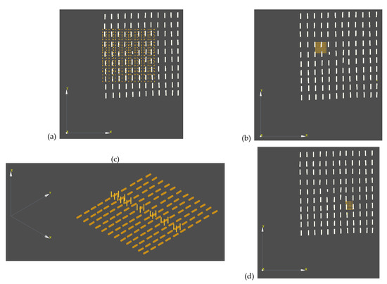 The wind speed sensors (yellow circles) of the MUST wind tunnel experiment: (a) coarse network, (b) dense network, (c) vertical profiles, (d) uw levels. The 120 obstacles are also presented.