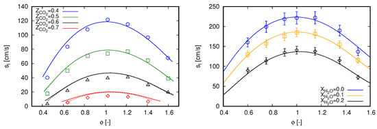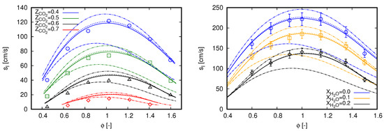 Similar to the behavior observed for flames diluted with in Figure 2 (left), the DTU mechanism predominantly delivers lower flame speeds than those achieved with GRI 3.0 in flames diluted with as presented in Figure 2 (right). Slightly higher flame speeds, when compared with GRI 3.0 results, are only noticed at the richest portion for the difference scenarios. In contrast to the observed for flames diluted with in Figure 2 (left), this overall behavior shifts results achieved with DTU mechanism away form the experimental data when dilution with water is accounted for, namely for and .