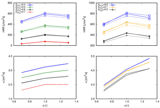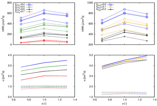 In Figure A1, the effects of radiation heat transfer are clearly noticed. As heat is transferred from the hot gases to the ambient, maximum flame temperature is clearly reduced. This temperature reduction is intensified as the dilution fraction increases. This is expected, since is a contributing species for radiation heat transfer (see Section 2.1). Another important aspect refers to the higher dilution fractions achieved when heat losses are not accounted for. In general, dashed lines in Figure A1 reaches higher values of than those related to the radiation heat transfer calculations.