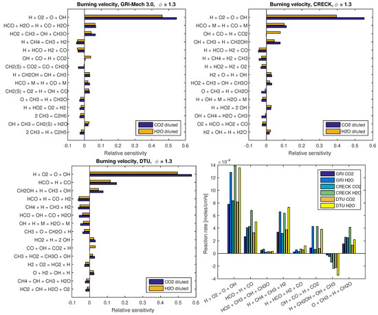 Figure 4 presents sensitivity coefficients of and reaction rates of the different mechanisms evaluated at for dilution at and dilution at . These two operating points are chosen since computed flame speed values on them depict clear deviations among mechanisms and, with respect to the dilution fraction, both correspond to intermediate conditions from those presented in Figure 3. By comparing the 15 most sensitive reactions of each mechanism, as shown in the sensitivity analysis presented in Figure 4, it turns out that each mechanism behaves in a specific and different fashion from the others. Nevertheless, some of these most sensitive reactions are common to them, which allow a comparative analysis. As expected from such kind of investigations (see, e.g., [15]), the chain branching reaction H + O2 = OH + O is the most sensitive reaction of all mechanisms. The second most sensitive reaction is the decomposition of HCO in H + CO, which occurs in terms of reactions HCO = H + CO for the DTU mechanism and with a third body M and HO in the CRECK C1-C3 and GRI 3.0 mechanisms, respectively. Specific to the GRI 3.0 mechanism, the decomposition of HCO in H + CO also occurs with the presence of a third body M as the ninth most sensitive reaction. Some of the remaining most sensitive reactions are common to all tested mechanisms, which are summarized in the reaction rate plot (Figure 4, right-bottom). In contrast to the two most sensitive reactions, the remaining ones are not in the same sequence for the different mechanisms.