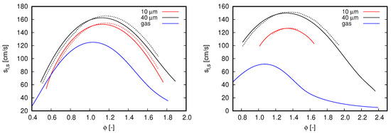 In contrast to flames propagating in fuel droplet mists (e.g., [18,19]), the existence of evaporating droplets does not attenuate the deviations between unitary and non-unitary Lewis number approaches. In all scenarios, the overall behavior observed in Figure 9 is quite similar to the results presented in Figure 7 for single-phase flames.