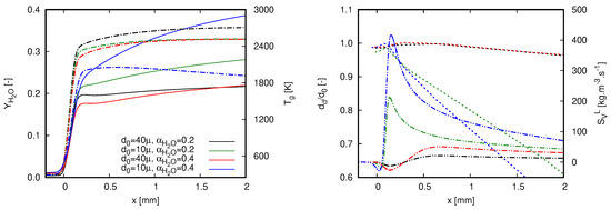 Figure 6 depicts the structure of stoichiometric flames for the different dilution fractions and droplet initial diameters. On the left side of Figure 6, gas phase quantities are plotted, namely the mass fraction of water and temperature. On the right side, normalized droplet diameter by its initial diameter () is presented together with the source term of vapor.