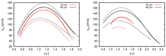 Flame speed computed with different diffusion transport modeling strategies for flames propagating in droplet mists. Continuous lines, complex; dashed lines, mixture-averaged without thermal diffusion modeling; dash-dot-dot lines, mixture-averaged with thermal diffusion modeling; dash-dot lines, unitary Lewis number. (left) ; and (right) .
