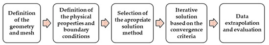 Due to several advantages of using numerical simulations, computational atherosclerosis studies have gained popularity in recent years [53]. In general, to perform numerical simulations three main steps have to be accomplished, the pre-processing, the solver, and the post-processing. Firstly, it is necessary to define the geometry of the problem, followed by the mesh generation. Secondly, the fluid properties of blood, the flow physics model, and the boundary conditions are defined in order to solve the mathematical model. Finally, after the problem being solved, the results are analyzed. These steps are drafted as follows in Figure 1.