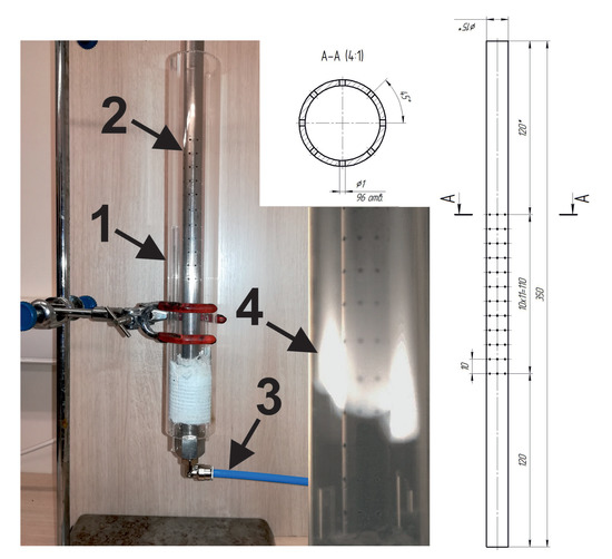 Photography of the coaxial burner (1—outer channel made of glass, 2—inner steel channel with perforated wall, 3—feeding system), instant photo of the flame front (4) and scheme of the inner channel.