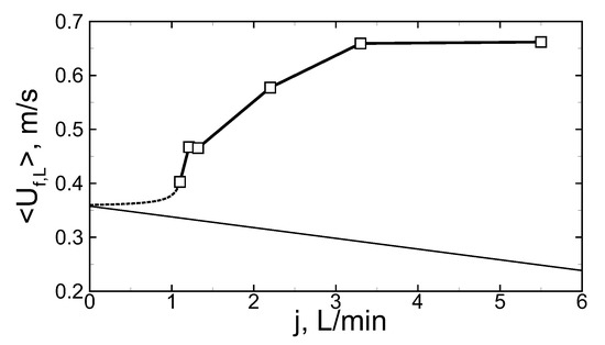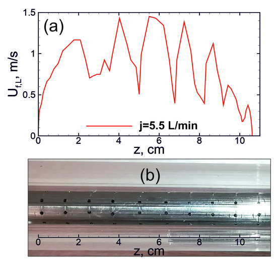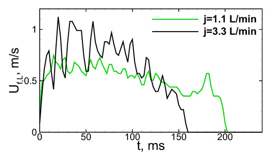 After ignition at the upper exit of the coaxial burner, a combustion wave is formed and propagates downwards. Herewith, the mode of flame propagation occurs to be non-steady, as it can be seen from the analysis of the typical history of the flame speed along the burner length (Figure 2). The value of was obtained as time derivative of the trajectory of the flame front leading point. First of all, one can observe the non-monotonic behavior of the flame speed that illustrates that the flame propagates in an oscillating mode. Herewith, the average flame speed occurs to be higher than one expected for a single-chamber burner in which the flame speed in the laboratory reference frame can be calculated as a sum of the burning rate () and flow velocity (u): . In the quiescent mixture, flame speed equals the normal burning rate, while in the burner with the counter-flow the flame speed usually should be lower and turns to be equal to zero when the counter-flow speed equals the normal burning rate by its absolute value (). Numerical analysis of the flow through the burner shows that there is a certain reduction in the counter-flow velocity after flowing through the perforated wall between the inner channel where the mixture is fed and the outer channel where the mixture is ignited (Figure 1). The factor by which the counter flow velocity is reduced for stoichiometric methane–air mixture equals 5.3. Thus, for example, in the case of the flow rate of 5.5 L/min the gas velocity at the entrance of the inner channel equals 0.59 m/s, while at the exit of the outer channel, it equals 0.11 m/s. Under such conditions, the flame speed can be estimated via as 0.25 m/s, while the average value of the flame speed along the burner equals 0.66 m/s in the experiment. So there is an obvious acceleration of the combustion process in the considered burner. Figure 3 illustrates the dependence of the average flame speed on the flow rate in the range from 1.1 to 5.5 L/min. Thin line represents the estimation according to the formula . So, one can observe the permanent increase in the flame speed with the flow rate in the whole considered range of the flow rates.