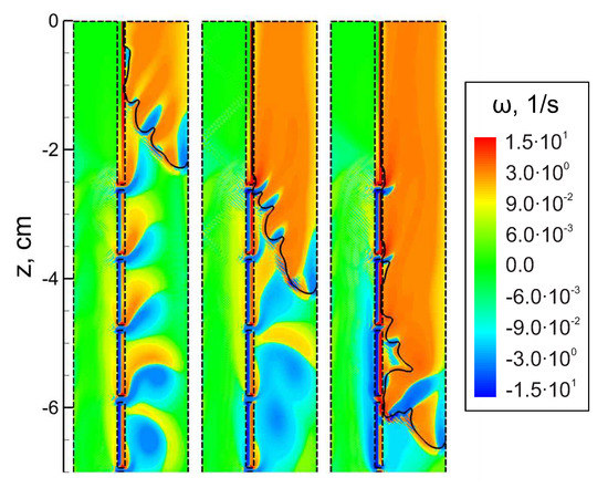 The performed calculations demonstrate only single flame-to-vortex interaction that is related to certain limitations of two-dimensional axisymmetric problem setup. These limitations are associated primarily with the lower dimensionality and approximate model of the flow through the round holes in the inner wall, and one should expect a more complex flow pattern related to the jet-like gas injection in reality. Every hole represents a source of vorticity, so the process of flame propagation through the outer channel can be considered as an interaction of propagating flame with a vortex street. Such a behavior of the flame can be observed in a more pronounced way at the high intensity of the flow. Thus, for example, at a high flow rate, the oscillations of the flame speed occur to be quite regular and correlate with the positions of holes (Figure 5). The flow pattern is qualitatively similar to that considered in [26,27], where several vortices were evenly distributed along the closed tube volume. Numerical analysis performed in [26] shows that the regular pattern of vortices distributed in the combustion chamber can sufficiently increase the flame propagation intensity and reduce the burn-out time. Herewith, the intensity of vortical flow determines the acceleration of the burn-out process that is consistent with the flame acceleration at the rising flow rate depicted in Figure 3.