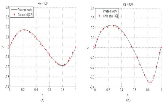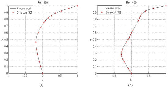 The objective of this subsection is to validate the numerical method used in this work. For that, we consider a viscous, unsteady, incompressible fluid in a lid-driven cavity. For the sake of clarity, all walls are considered with no-slip or impervious boundary conditions, except the velocity at the upper wall set to unity (see Figure 2). To verify the validity of our results, we compare the profiles of the velocity components with the reference [35] at the median of the cavity, for different Reynolds numbers: 100, 400, and 1000.