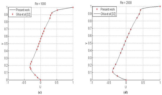 Profile of the horizontal velocity (u) along y with (x = 0.5), for (a) Re = 100, (b) Re = 400, (c) Re = 1000, and (d) Re = 2000.