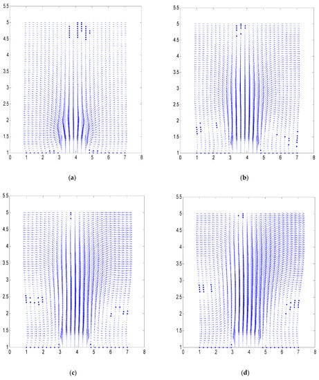Velocity fields at: (a) t = 1 s, (b) t = 5 s, (c) t = 7 s, (d) t = 10 s.