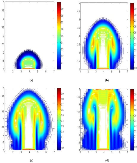 Iso-concentration at: (a) t = 1 s, (b) t = 5 s, (c) t = 7 s, (d) t = 10 s.