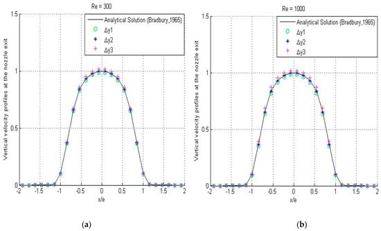 To ensure the validity of the present numerical scheme, in Figure 9 we provide a valuable insight into the grid domain sensitivity of the jet flow, by presenting the vertical velocity profiles for different steps of y-direction (direction of the jet flow), and compare them with the analytical solution of Bradbury (1965), these comparisons will be presented for different Reynolds numbers. To assess the grid sensitivity and evaluating mesh dependence to the accuracy of the jet flow, we use different two-dimensional grids mesh , and adopting a systematical increase of mesh points in y-direction, the step in y-direction is defined as , where H is the height of computational domain. The different finite grids used in this validation test are 26 × 61. 26 × 75, and 26 × 90, leading respectively to different steps in y-direction , , and .