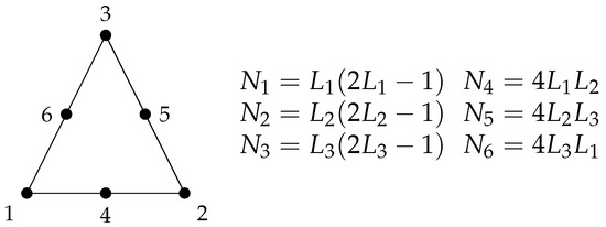 6-noded triangle finite element with quadratic interpolation , and are the linear combination of the triangle area coordinates and , , , , and are the resulting shape functions.