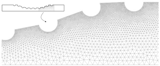 The Figure 3 shows a part of the quadratic triangular mesh for the Curved Channel with stent geometry. This mesh was generated by the GSMH open source software and the same type of mesh was used for all the geometries shown in Figure 2. As can be seen, it was used a unstructured triangular mesh, where it has a greater refinement close to the drug-eluting stent semi-circles. Thus, it is expected to observe the dynamics of drug diffusion with greater accuracy close to the region of the boundary layer.