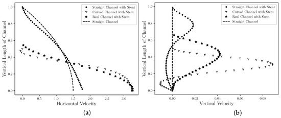 The state steady of the blood horizontal (a) and vertical (b) velocities profiles in the middle ( R) for the straight channel, the curved channel and the real channel with drug-eluting stent. The velocities values are presented by nondimensional values and it is estimated that the drug-eluting stent implantation modifies the velocities profiles for all cases.