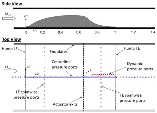 Schematics of the hump model in the wind tunnel. Top view shows surface static and dynamic port locations relative to the hump model.