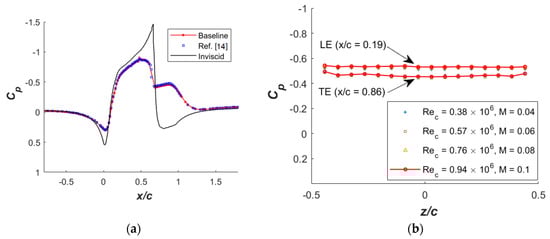 The baseline separated flow over the hump model was previously reported numerically and experimentally in Refs. [14,16,20]. Although the incoming boundary layers were different from the reference dataset, this model was shown to be negligibly sensitive to the incoming flow [1]. This is presented in Figure 3a, where the centerline pressure (Cp) distribution is compared to that of the reference dataset [14]. Overall, the current Cp distribution agrees well with the reference dataset. The decelerated flow upstream of the hump model rapidly accelerates until x/c = 0.2 due to the favorable pressure gradient, then the acceleration relaxes, and the pressure distribution reaches peak suction near x/c = 0.5. A small step between the aluminum forebody and the stainless steel slot-lip section results in a pressure discontinuity near the suction peak [14]. The pressure recovery starts immediately after the suction peak and continues until flow separation near x/c = 0.66, which is indicated by a plateau in the Cp distribution. After flow separation, flow accelerates over the separation bubble as shown by the gradual increase in the Cp distribution. The pressure appears to be recovered downstream of the model trailing edge near x/c = 1.3 due to the separated flow and the splitter plate. The inviscid flow solution of the three-dimensional hump model [21] is also presented in this figure. The ideal (i.e., inviscid) flow over the hump model results in more flow deceleration near the leading edge of the model and more acceleration afterward. There is a consistent increase in the suction pressures reaching up to Cp = −1.5 (almost 50% more than that of the separated flow case) at x/c = 0.66, where flow normally separates for the baseline case. After the peak, the suction pressure suddenly drops and recovers to the tunnel pressure downstream. Although an ideal case, the inviscid flow solution will be used as a target for the flow control comparisons.