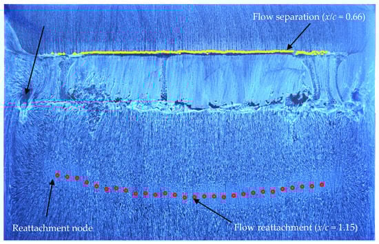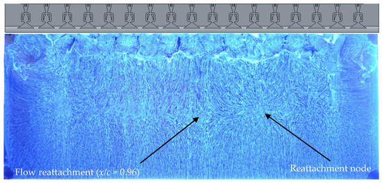 Surface oilflow visualization for the baseline separated flow is presented in Figure 4. The flow direction is from top to bottom. Two small corner vortices are observed downstream of the separation line at each side. The previously developed oilflow visualization technique enabled surface flow visualization for the entire model span without any excessive oil accumulation. As shown in this figure, the separation line is essentially two-dimensional with the exception of the near-endplate regions. The oilflow visualization image was post-processed to find the flow separation and reattachment locations. The separation location was found to be at x/c = 0.66, similar to the reference dataset [14]. The flow reattachment is fairly uniform around the centerline; however, the reattachment points move upstream near the corner vortices. Each corner vortex interacts with the separated flow to form a reattachment node, where one can see oil movement in all directions. The average reattachment location around the centerline is x/c = 1.15, which was reported as x/c = 1.11 in the reference dataset [14].