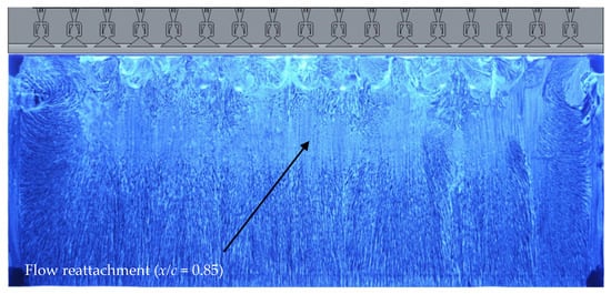 Figure 6 shows the surface oilflow visualization for the fluidic oscillator case with Cµ = 0.11%. The fluidic oscillator array is shown on top of the figure as well. The flow visualization shows the separation bubble and the reattachment location. The flow reattachment appears to be at x/c = 0.96 near the centerline (z/s = 0); however, it moves upstream to x/c = 0.92 away from the centerline. The reversed flow is still strong and able to transport oil material upstream even though the size of the separation bubble is reduced by almost 40% compared to the baseline case. The lateral flow on the reattachment line is visible in the flow visualization image forming a saddle point-like reattachment near the center. Each side of the figure shows two small reattachment nodes and a corresponding saddle point in between. Local oil accumulations are also observed downstream of the actuator exits. Because of the complex flow (i.e., tunnel flow, oscillating jet flow from actuators and the reversed flow of the separation bubble) and the gravity that pulls the oil material down, this oil accumulation location cannot be discerned as a separation location. Another surface oilflow visualization for the fluidic oscillator flow control case at a slightly higher momentum coefficient (Cµ = 0.24%) is presented in Figure 7. Although the attached flow downstream is visible in the form of oil streaks, the reattachment location is not visually clear due to low shear stress. Post processing the flow visualization image reveals the reattachment location as x/c = 0.85. The signature of reversed flow (oil streaks) is visible locally, especially downstream of the gaps between the actuators. Globally, flow reattachment appears to be two-dimensional. Similar to the low momentum case in Figure 6, the separation location could not be predicted accurately due to the complex flow near the actuator exits.