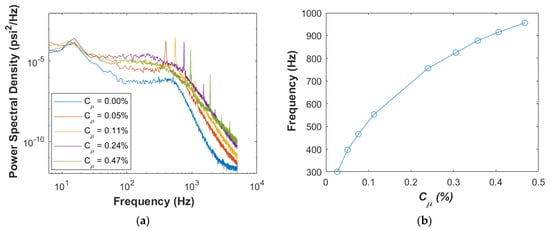 The jet emitting from the fluidic oscillators oscillates at a specific frequency that depends on the actuator geometry and the mass flow through. A typical power spectral density (PSD) of an oscillating jet is shown in Figure 8a. The pressure signal of the fluidic oscillator jet was acquired from the unsteady pressure transducer that is close to the actuator exit (port#1, see Figure 2). As shown in this figure, PSD of the baseline pressure signal does not show a preferred or shedding frequency associated with the separation bubble similar to the previous studies [1,14]. Compared to the baseline case, the fluidic oscillators amplify the spectrum for most of the frequencies. Different momentum coefficients (i.e., mass flow) resulted in different oscillation frequencies (i.e., frequency peak in the spectrum). Higher harmonics are also visible in the spectrum. By recording the peak frequencies, the actuator oscillation frequency is obtained as a function of the momentum coefficient (Figure 8b). As presented in the figure, the frequency has a logarithmic trend with respect to Cµ (~) that is typical for the fluidic oscillators.
