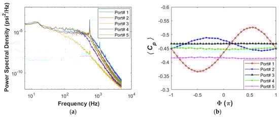 The instantaneous phase of the signal is obtained by calculating the angle between the real and imaginary part of the analytical signal, Pa(t). Then, the phase averaging is performed by grouping the pressure data into the prescribed bins of phase angles. The quality of the result is improved by applying a bandpass filter to the reference signal. Since all unsteady pressure were acquired simultaneously, the strongest signal (i.e., the signal from the nearest pressure port) can be used as a reference signal to phase average the other unsteady pressure measurements. The phase-averaged pressure distributions for the first five ports are presented in Figure 9b. As shown in this figure, the pressure signal has an oscillatory behavior that can be phased averaged. The magnitude of the oscillation is reduced for the second port, but the pressure signal is still periodic. Consistent with the PSD figure in Figure 9a, there is not any periodic component found for the rest of the ports and the phase averaging is basically the same as the arithmetic averaging.