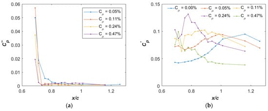 Fluctuating pressures in the pressure recovery region with varying momentum coefficient are presented in Figure 10b. Note that the fluctuating pressures shown in this figure are random fluctuations calculated using Equation (7). The fluctuating pressures usually peak near (slightly upstream of) the flow reattachment due to the intermittent nature of the reattachment process and the associated unsteady stagnation point [1]. Although not precise because its resolution depends on the pressure transducer’s spacing, the Cp’ peak is a good indicator of the flow reattachment location. For example, the reattachment location from the Cp’ distribution is at x/c = 1.16, whereas the oilflow visualization indicated it to be at x/c = 1.15, near the centerline for the baseline case. The Cp’ distributions appear to have comparable magnitudes near the reattachment location. Even applying very low amplitude excitation (Cµ = 0.05%), the fluidic oscillators are able to reduce the separation bubble (Cp’ peaks at x/c = 0.99). Increasing the momentum coefficient to Cµ = 0.11% resulted in a broad Cp’ distribution, but the peak Cp’ location appears to be near x/c = 0.9. The reattachment location was estimated to be at x/c = 0.96 from the oilflow visualization in Figure 6. Consistent with the static pressure distributions in Figure 5a, the Cp’ peak pressures move upstream due to the shorter separation bubble as the flow control authority increases with the momentum coefficient. The Cµ = 0.24% case provided a distinct peak near x/c = 0.8. The reattachment location was estimated to be at x/c = 0.85 from the oilflow visualization in Figure 7, indicating a significantly reduced separation bubble. For the highest excitation amplitude (Cµ = 0.47%), the fluctuating pressure distribution has a peak at the second port (x/c = 0.71); however, this peak may be the result of three-dimensional flow structures near the actuator exits that was observed as drastic changes in Cp’ values for the first four unsteady pressure ports. This conclusion is also in line with the centerline pressure distribution that does not indicate any flow separation (no plateau in the Cp distribution). In addition, the pressure drag coefficient, which indicates the separation bubble, was almost zero in Table 1.