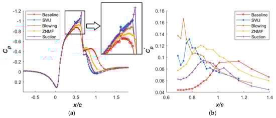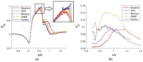 Comparison of different active flow control (AFC) methods for Cµ = 0.11%: (a) centerline pressure distribution; (b) fluctuating pressure distributions.
