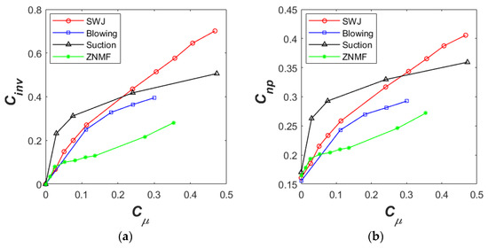 The variation of these quality metrics with respect to the momentum coefficient is presented next. Figure 13a shows the comparison of different actuators based on the quality metric, Cinv. As mentioned before, Cinv indicates closeness to the inviscid flow solution, where Cinv = 0 corresponds to baseline, and Cinv = 1 corresponds to the inviscid flow pressure distributions. Figure 13a shows the characteristics of different AFC methods in achieving an inviscid-like pressure distribution by controlling flow separation. Consistent with Table 2 and Table 3 and the Cp distributions, the ZNMF actuator is the least effective AFC method in achieving an inviscid-like pressure distribution. On the other hand, the steady suction appears to be the best AFC method at low momentum applications, Cµ < 0.2%. It has a logarithmic trend with Cµ but loses its superiority as Cµ increases. The fluidic oscillators (SWJ) have a linear-like relation with Cµ. As shown in this figure, the fluidic oscillator is the best AFC method for higher momentum coefficients, Cµ > 0.2%. Note that the range investigated in this study is Cµ < 0.5%. The fluidic oscillator (or any pneumatic actuator) loses its effectiveness when the jet inside the actuators becomes chocked at higher Cµ. The fluidic oscillators at higher Cµ is discussed in Refs. [11,12]. The steady blowing also has a logarithmic trend; however, it is less effective than the steady suction or the fluidic oscillators for the entire Cµ range.