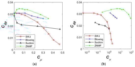 The variation of the pressure drag coefficient for different AFC methods with respect to: (a) momentum coefficient; (b) power coefficient.